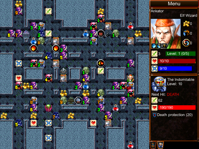 This dungeon is populated with animated armors, wraiths, sorcerers, steel golems, and illusions. The boss is an animated armor with 190 hp, 62 damage, and 20 death protections. The orb of lusory spawns here, and it grants 50% magic resistance. It can be destroyed to get rid of all illusions.