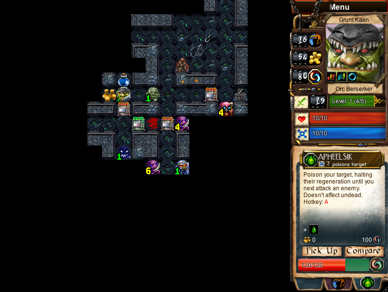 Killed some low level mobs to hit level 5. Killing this level 9 Wraith and I'm using a health potion to do so. It'll be worth it because it leaves a LOT of dark tiles to regen fight The Indom.