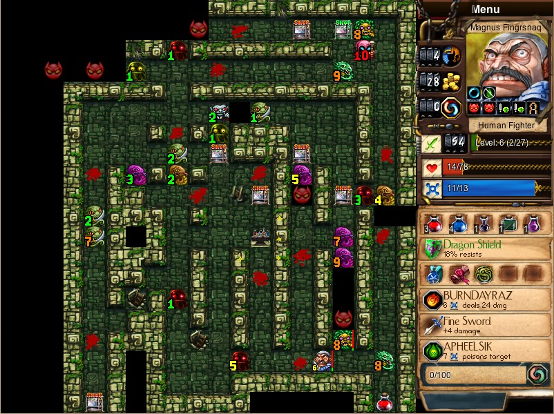 Okay, I've walked around, cleared some space and found two subdungeons. My normal subdungeon is a generic one with a sign and some gold. My secret subdungeon is filled with 20 gold piles. I am looking for a suitable target to kill right now. The snake 3 would be great (once again, use burning and then outlast them), but his poison would take out my regeneration capabilities. What to do...
